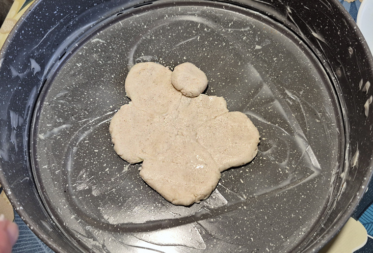 La seconda, più grande, serve da base, mentre la prima, più piccola, da copertura.Stendi la base con le dita direttamente nella teglia, un pezzetto per volta visto che non è molto elastica.