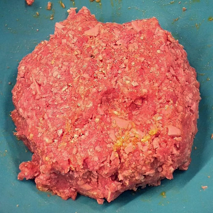 Mettiamo in un recipiente la carne macinata con l’uovo, la mortadella tritata, il formaggio, sale e pepe ed amalgamiamo tutto.