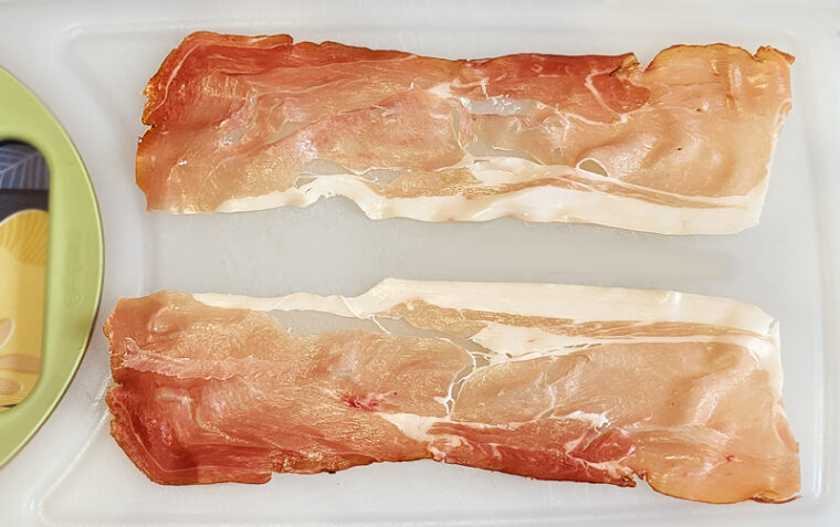 Disponi una fetta di speck sul tagliere, appoggiaci sopra una fetta di zucchina e spalma un po' di formaggio spalmabile, infine arrotola il tutto