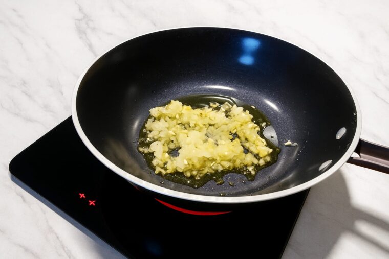 Fate soffriggere in un giro d'olio un trito fine di cipolla insieme all'aglio.