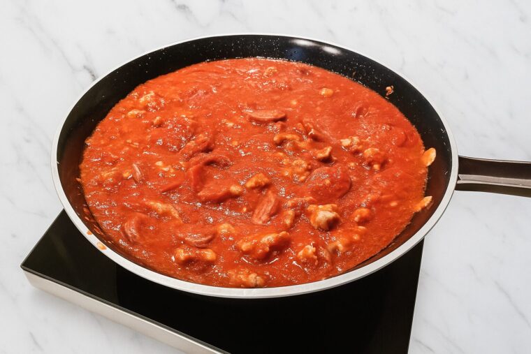 Aggiungete i pelati, mescolate il tutto e lasciate cuocere per circa 10 minuti a fuoco moderato.