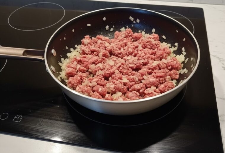 Nel frattempo togliete il budello alle salsicce di maiale, spezzettatele con le mani ed unitele al trito di cipolla ed aglio.