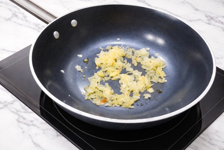 In una padella antiaderente fate scaldare, con un filo d'olio evo, una cipolla precedentemente pelata, lavata e tritata.