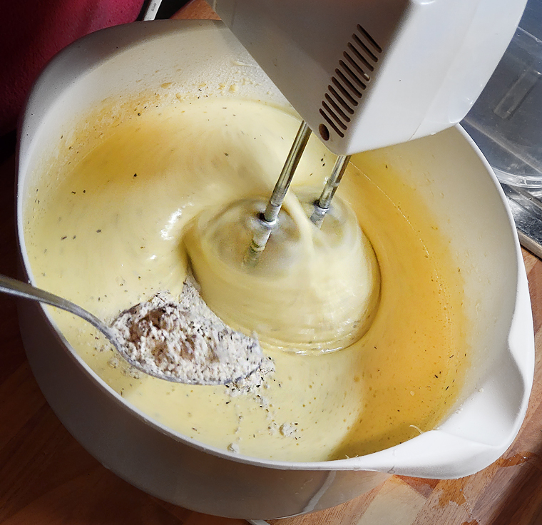 Aggiungi un pizzico di sale e, sempre mescolando, le farine setacciate.