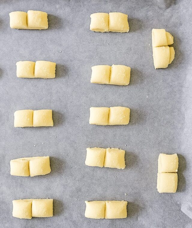 Trasferisci i ventaglietti sulla carta forno nella teglia, lasciando almeno 5 cm di spazio tra loro, per permettere ai ventagli di "crescere".